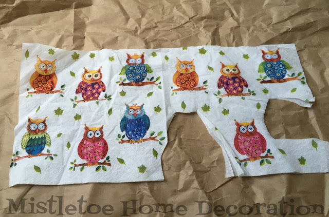 I cut out the owls from a paper napkin and I glued with decoupage glue on the surfaces.