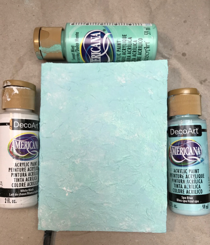 After drying, I coloured the cover with the following DecoArt Americana paints: White Wash, Sweet Mint, Spa Blue.